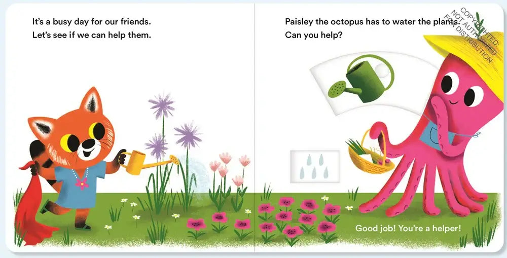 In YOU'RE A HELPER, the Beginning Baby animal friends are having a hectic day and they need assistance! Baby can help Paisley the octopus water plants, Layla the llama find a crayon, Mia the monkey tidy up toys, and other characters with their household tasks by pushing embedded slides. It all culminates in a comforting hug for Mateo the red panda, who's had a rough day.