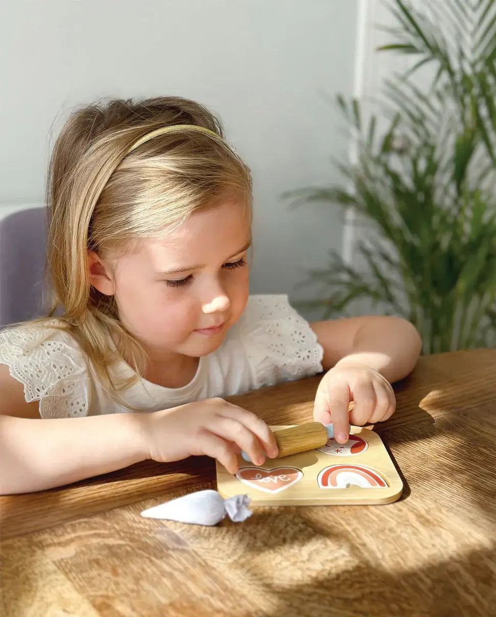 Get ready to whip up some fun with this cookie cutter set! With a shape-sorting tray for extra enjoyment, 4 delicious-looking pretend cookies, and a mini rolling pin, you'll have everything you need to create your own imaginary treats. And don't forget the pretend icing bag - for all your sweet decorating needs!