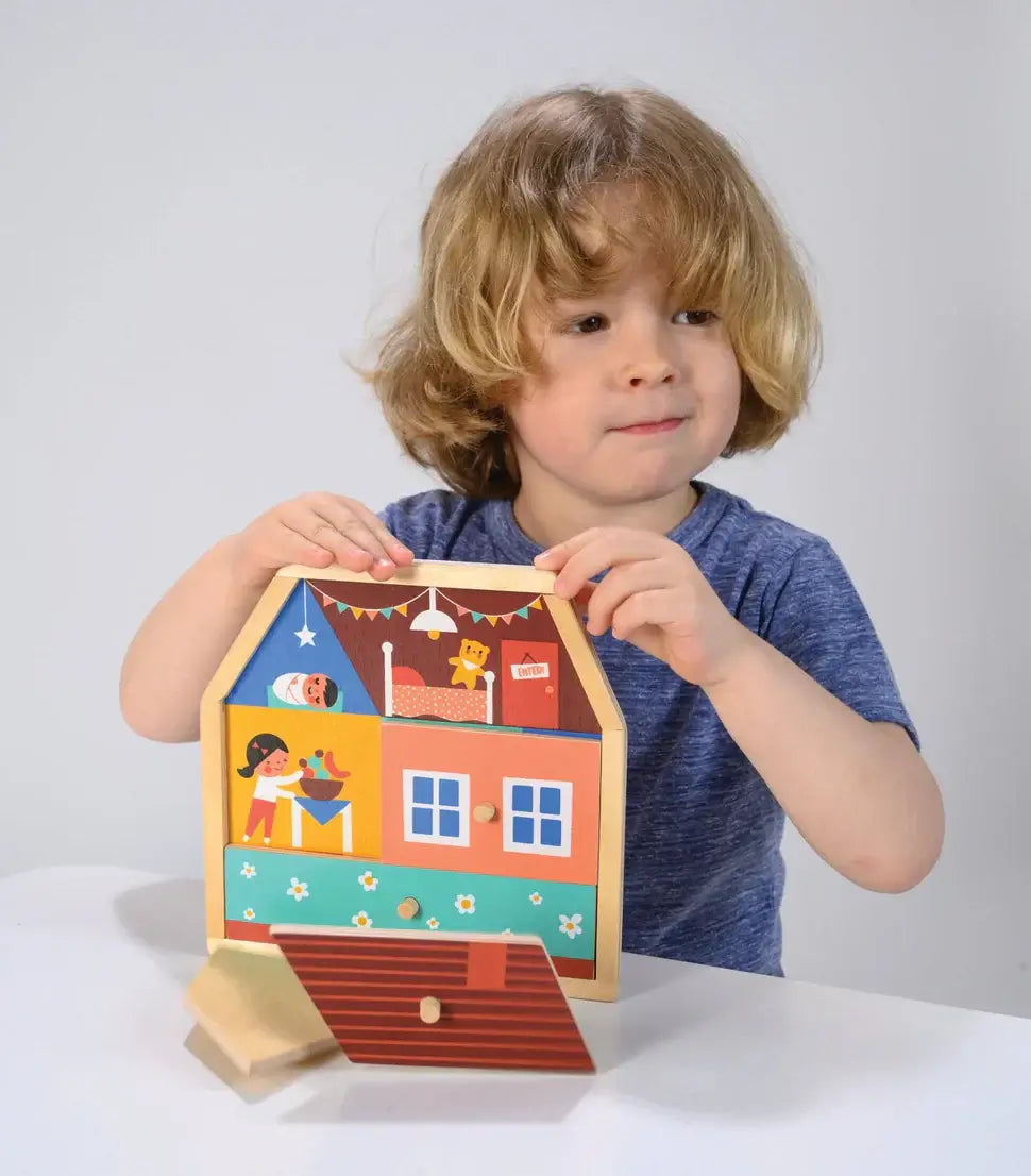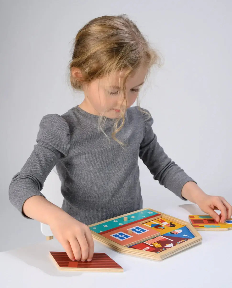 Unleash your child's curiosity with our House Puzzle! Shaped like a real house, this engaging toy includes 4 removable pieces, giving a peek at the house's interior. Made with sustainable wood, it's the perfect way to teach shape recognition and image matching.